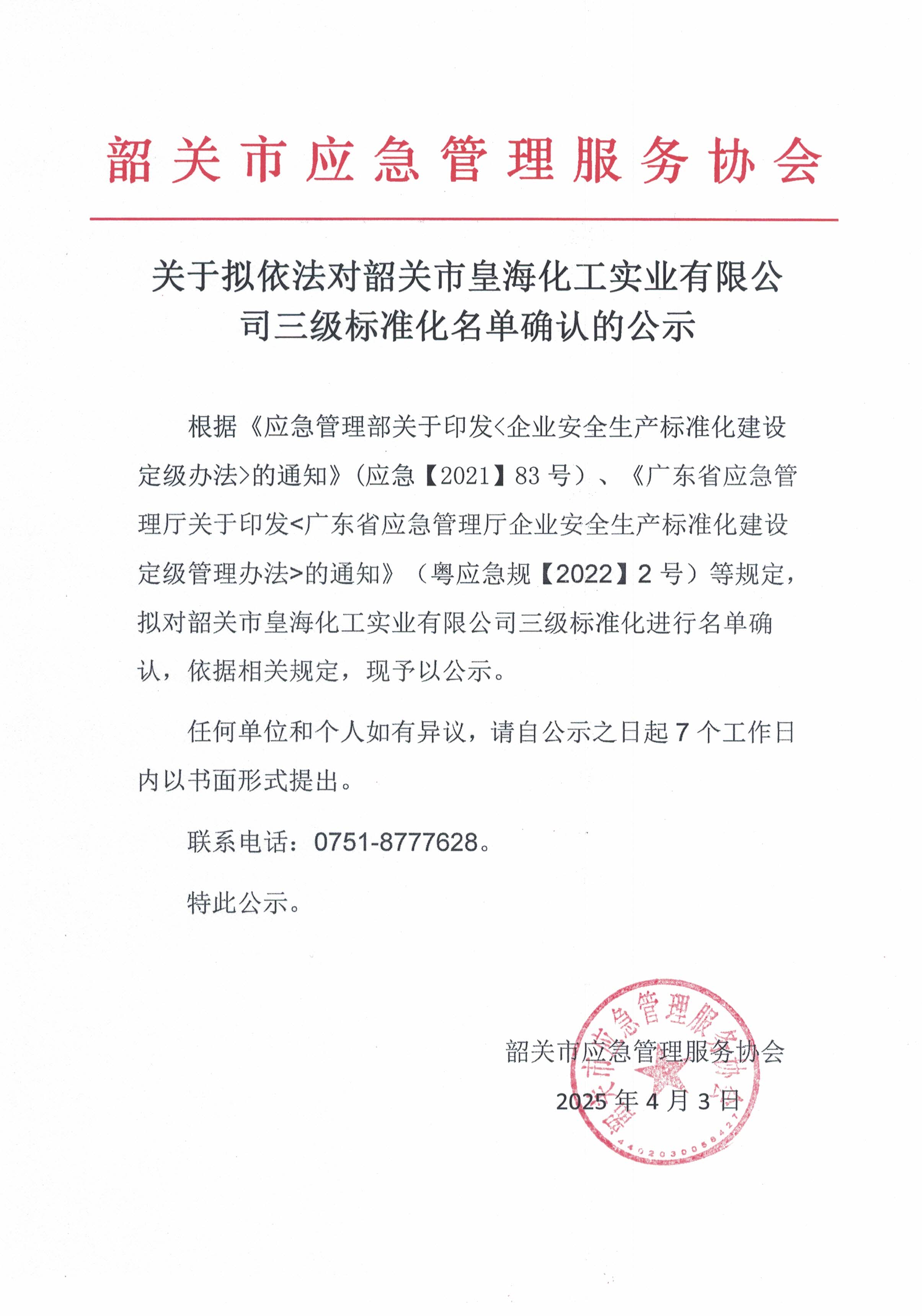 关于拟依法对韶关市皇海化工实业有限公司三级标准化名单确认的公示