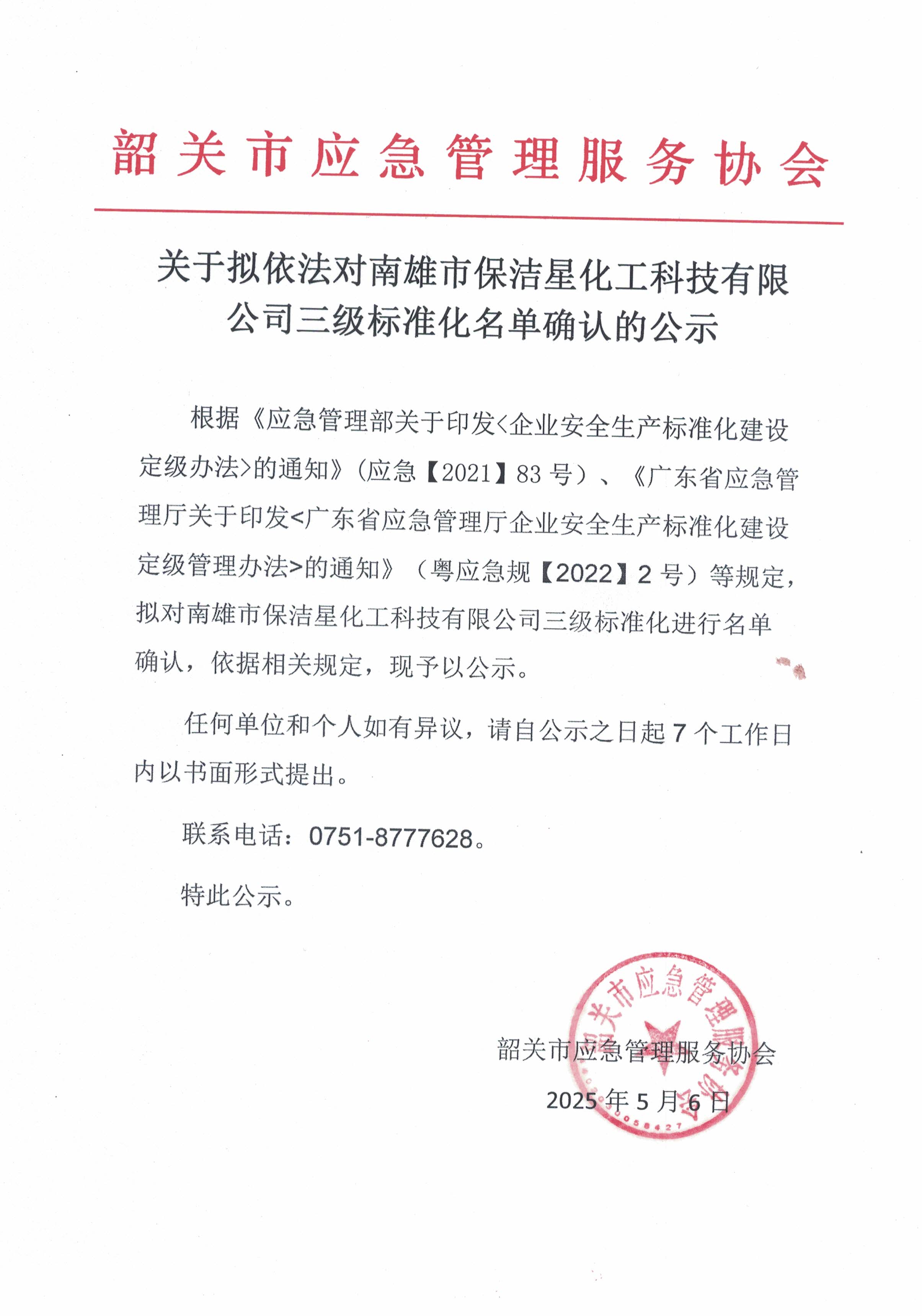 关于拟依法对南雄市保洁星化工科技有限公司三级标准化名单确认的公示