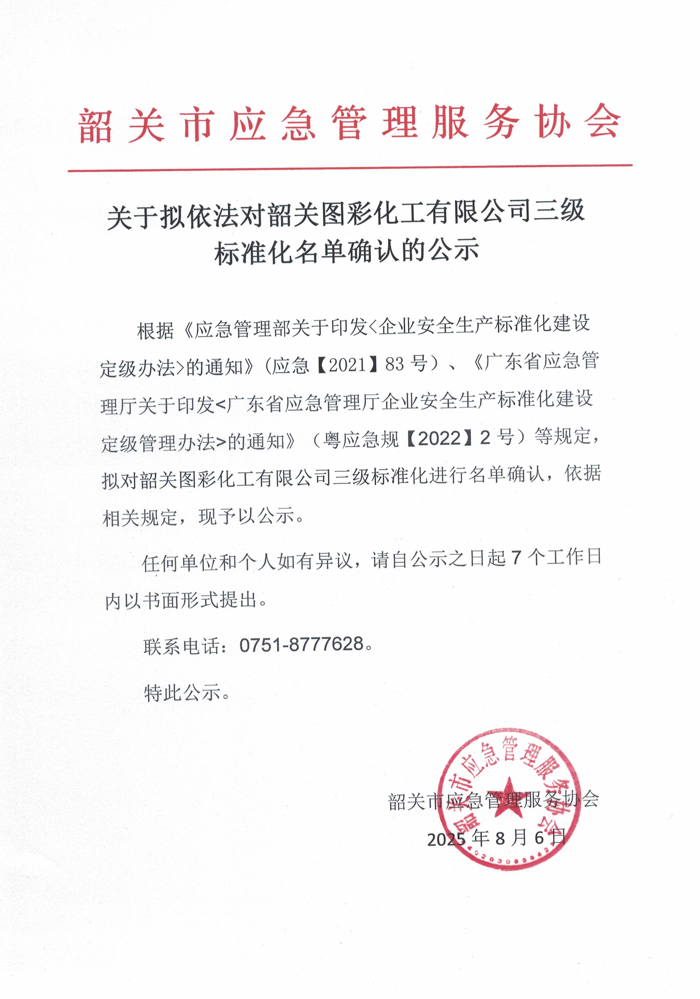 关于拟依法对韶关图彩化工有限公司三级标准化名单确认的公示